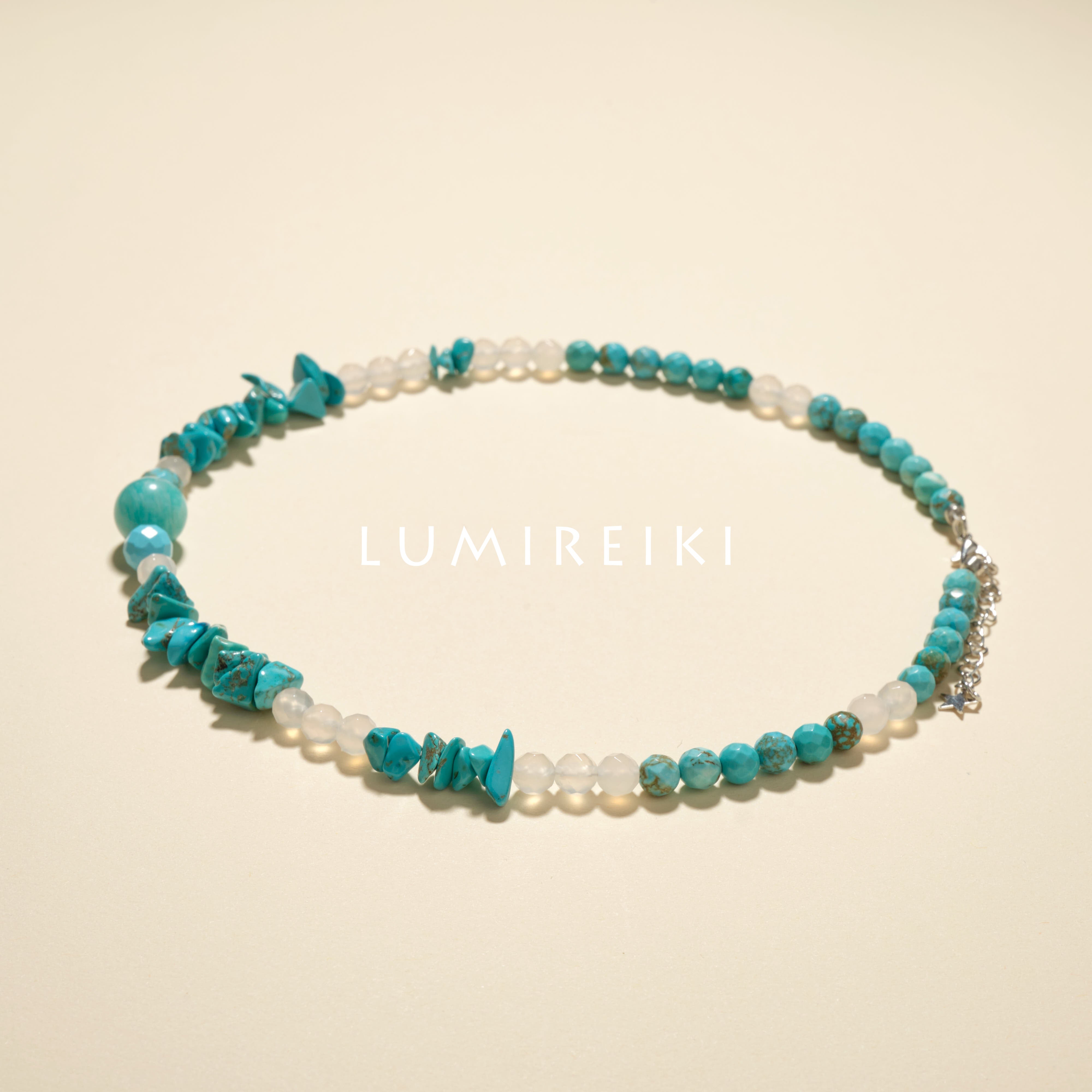This necklace aids those with communication stress or emotional tension. It soothes social anxiety, clears thinking, and eases throat discomfort from speaking. Amazonite calms nerves, while Turquoise and Milky Chalcedony enhance articulation and balance. Wear during meetings, presentations, or busy days to feel composed and connected, transforming stress into clarity.