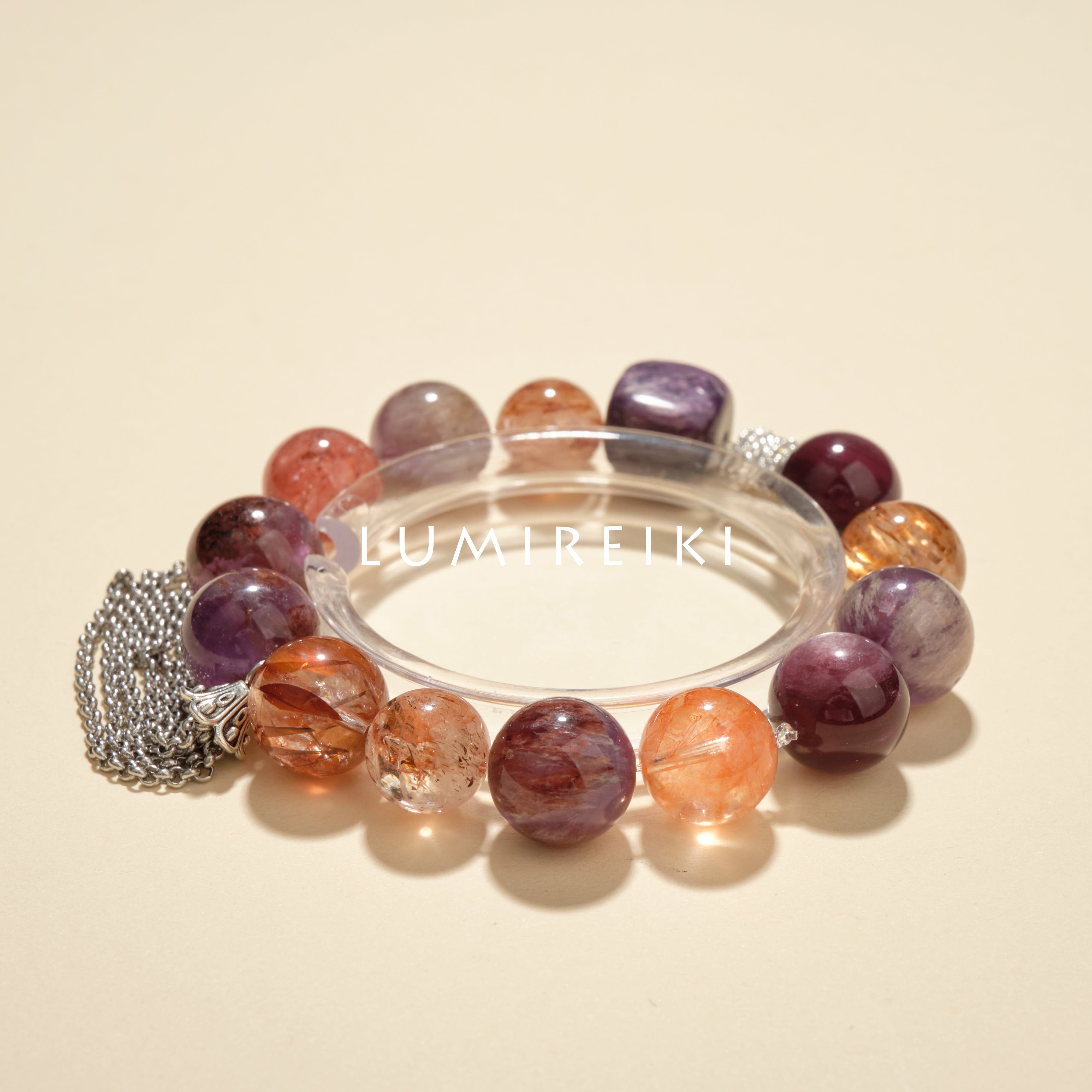 Mysterious and transformative, the Charoite Rebirth Bracelet is your key to a new you. Hailing from Russia, the Charoite at its heart lowers pulse rates, nurtures eye and heart health, and aids detox. Paired with Brazilian Black Gold Rutilated Quartz and Purple Phantom Quartz, it shatters old patterns, awakens spiritual awareness, and fortifies you against life's challenges.