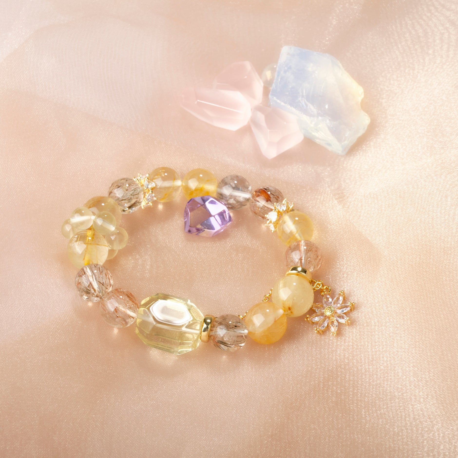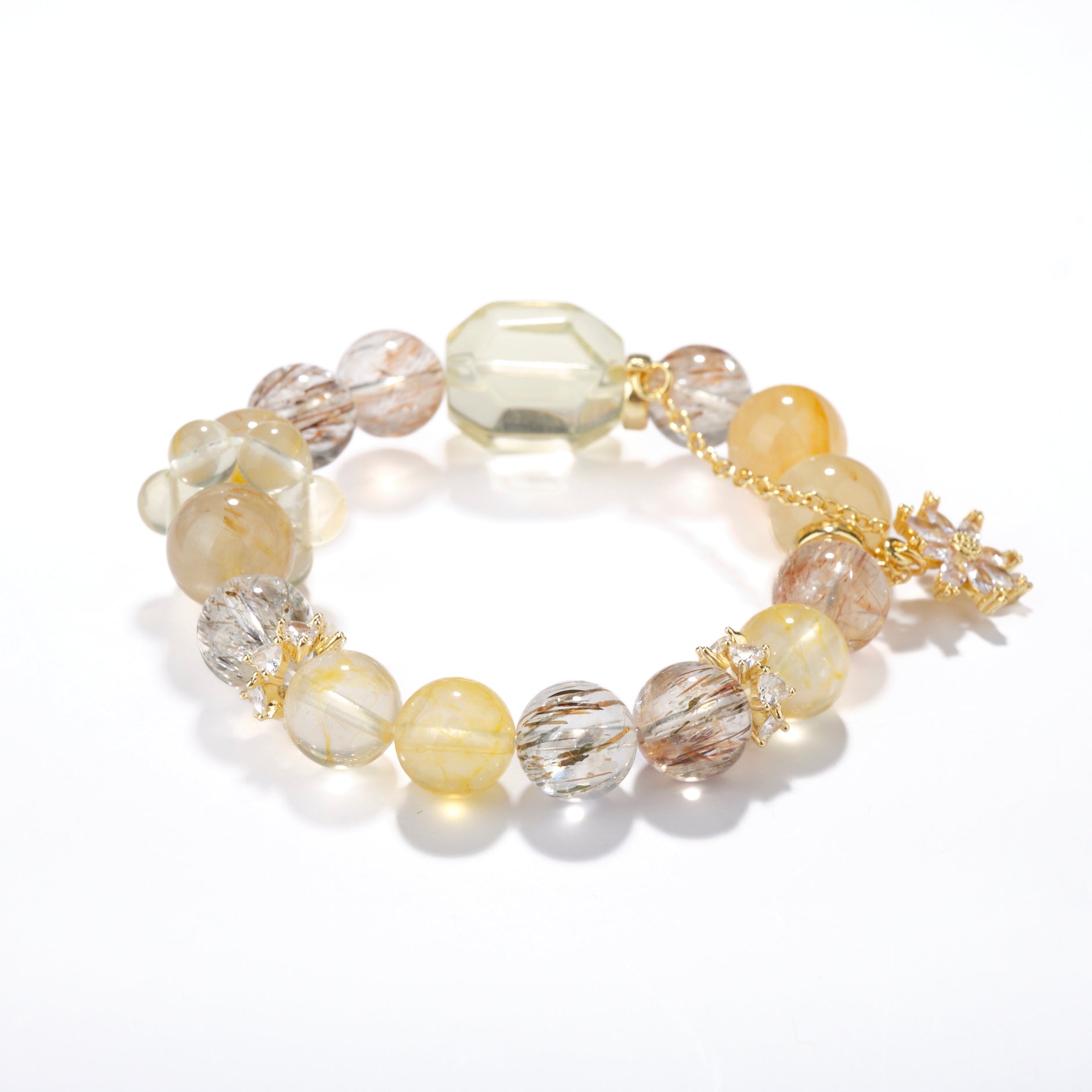 Una sinergia de piedras crea una Ecosistema de riqueza y energía : La fuerza de abundancia pura del Citrino, combinada con el estabilizador Black Gold Super y el cristal rubio, que impulsa la acción, garantiza que ninguna oportunidad se escape. La flor de gel amarilla equilibra las emociones, manteniendo a raya la avaricia. La textura natural de cada cuenta y sus tonos dorados degradados reflejan la calidez de la luz solar, irradiando positividad dondequiera que vayas.