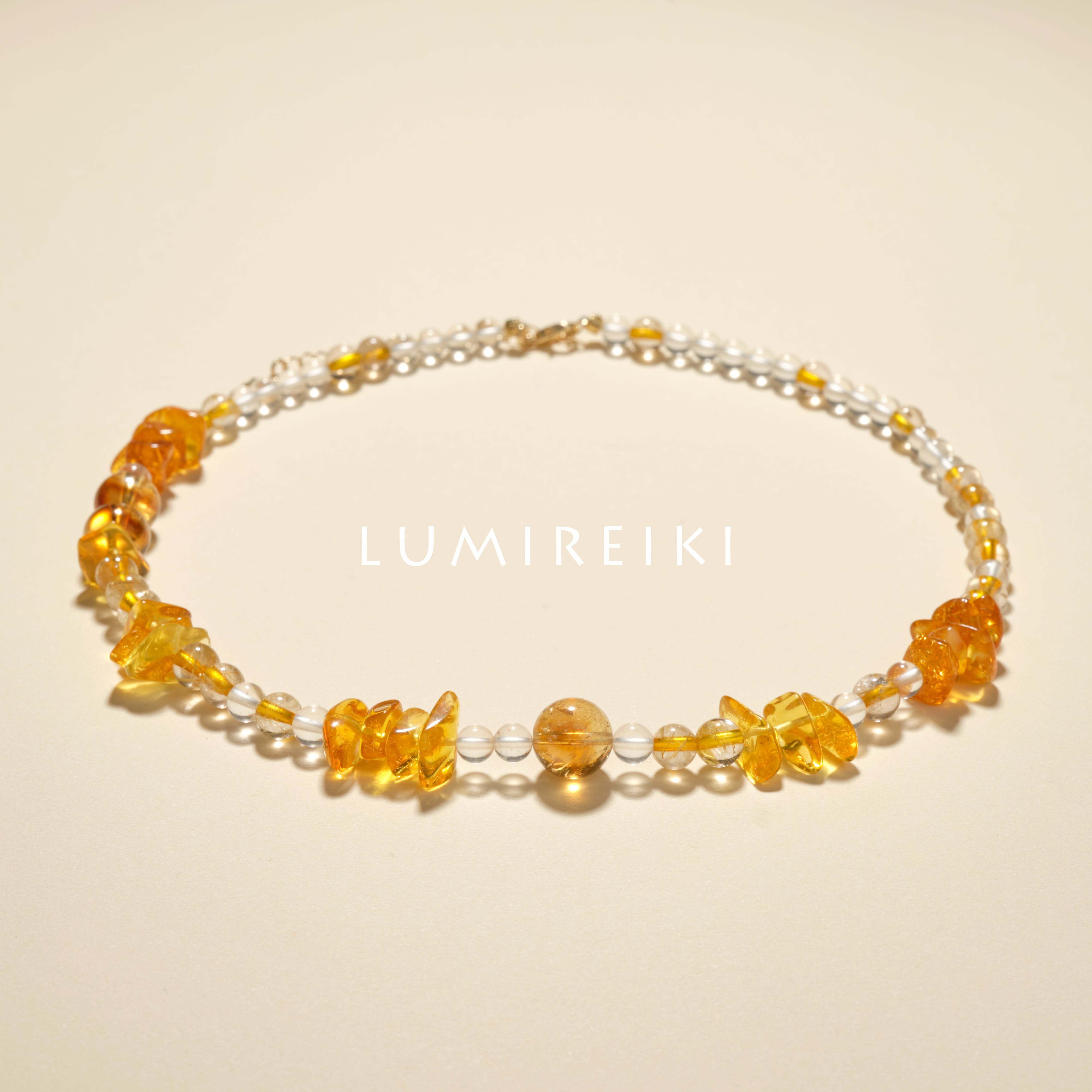 This necklace is for those struggling with daily life. If you're bogged down by work stress, facing digestive issues from long hours at a desk, or feeling creatively drained and anxious, it offers help. Citrine boosts your drive and eases digestive woes. Amber calms stress, White Quartz sharpens your focus, and Rutilated Quartz amps up your energy. Wear it to regain vitality and clarity in your daily grind.