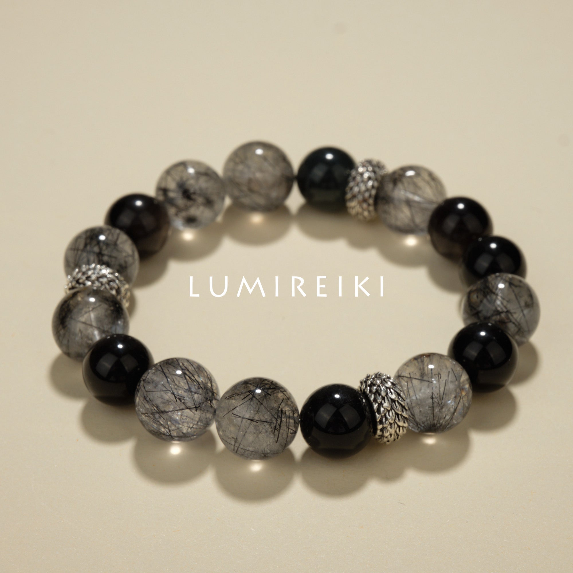 Esta pulsera es para quienes atraviesan los momentos difíciles de la vida: abrumados por plazos, atrapados en una decisión importante o agotados por las presiones diarias. Imagina una jornada laboral caótica, una reunión crucial o noches estresadas y sin dormir. El Cristal de Cabello Negro se abre paso entre el ruido, agudizando la concentración cuando necesitas liderar o decidir. La Obsidiana actúa como un guardián silencioso, protegiéndote de la pérdida de energía durante interacciones tensas o entornos abrumadores. Úsala al lidiar con tareas interminables, preparándote para una conversación importante o buscando la calma después de un día difícil. Es para quienes anhelan claridad, protección y un impulso constante de coraje para afrontar los desafíos, sin importar su tamaño.