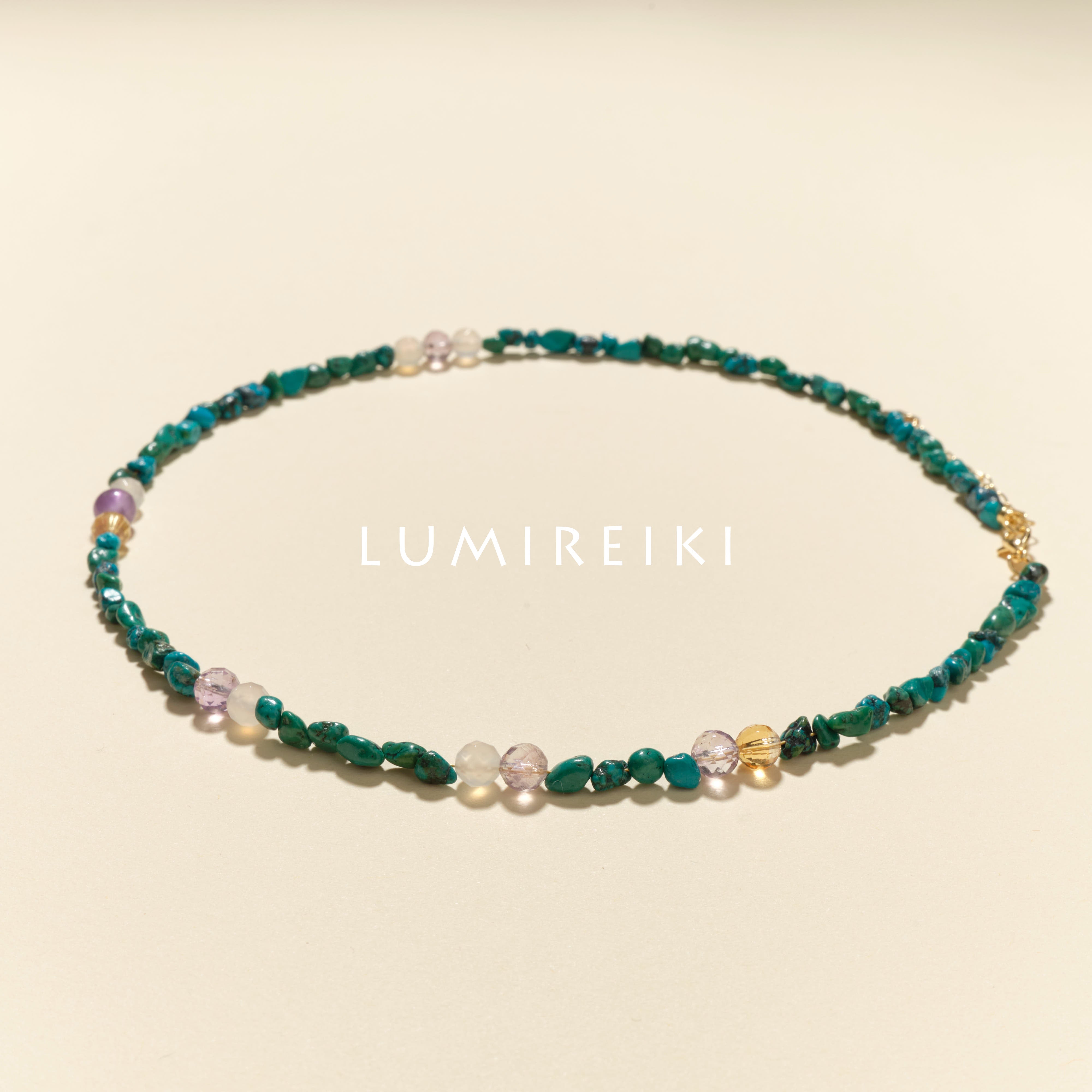 This necklace is for those grappling with the stresses of modern life. If you're troubled by poor sleep, digestive issues, or find it hard to communicate calmly during tense moments, it offers a solution. Malachite soothes negative emotions, Amethyst eases insomnia, Citrine aids digestion and creativity, and Milky Chalcedony calms the throat. Wear it to find balance and healing in your daily grind.