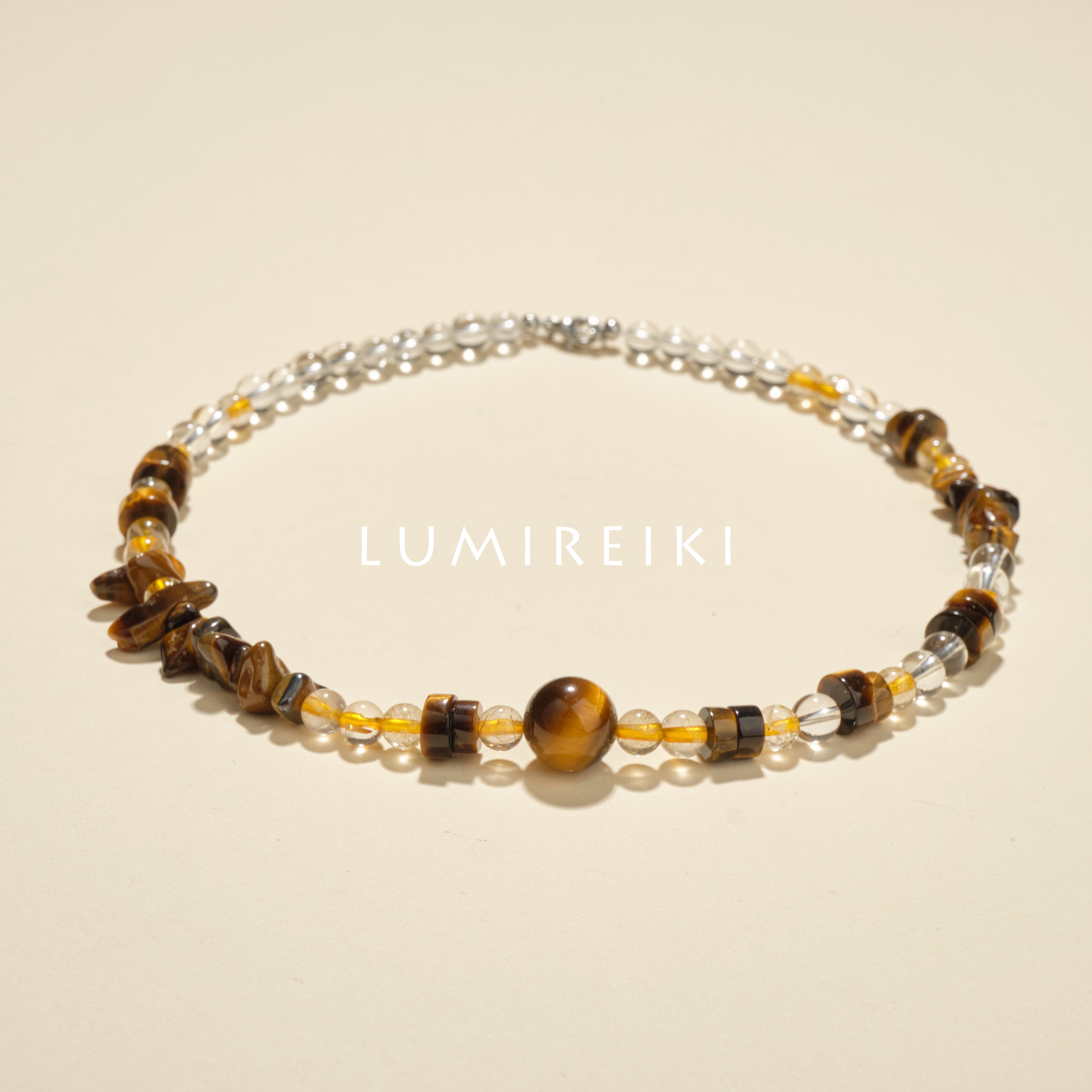 This necklace aids those overwhelmed by stress, self-doubt, or fatigue. Tiger's Eye boosts resilience for high-pressure work or challenges, White Quartz clears mental fog during chaos, and Rutilated Quartz fuels stamina for long days or physical tasks. Wear it to feel grounded and empowered in daily grind—navigating meetings, leadership, or strenuous days with focus and courage.