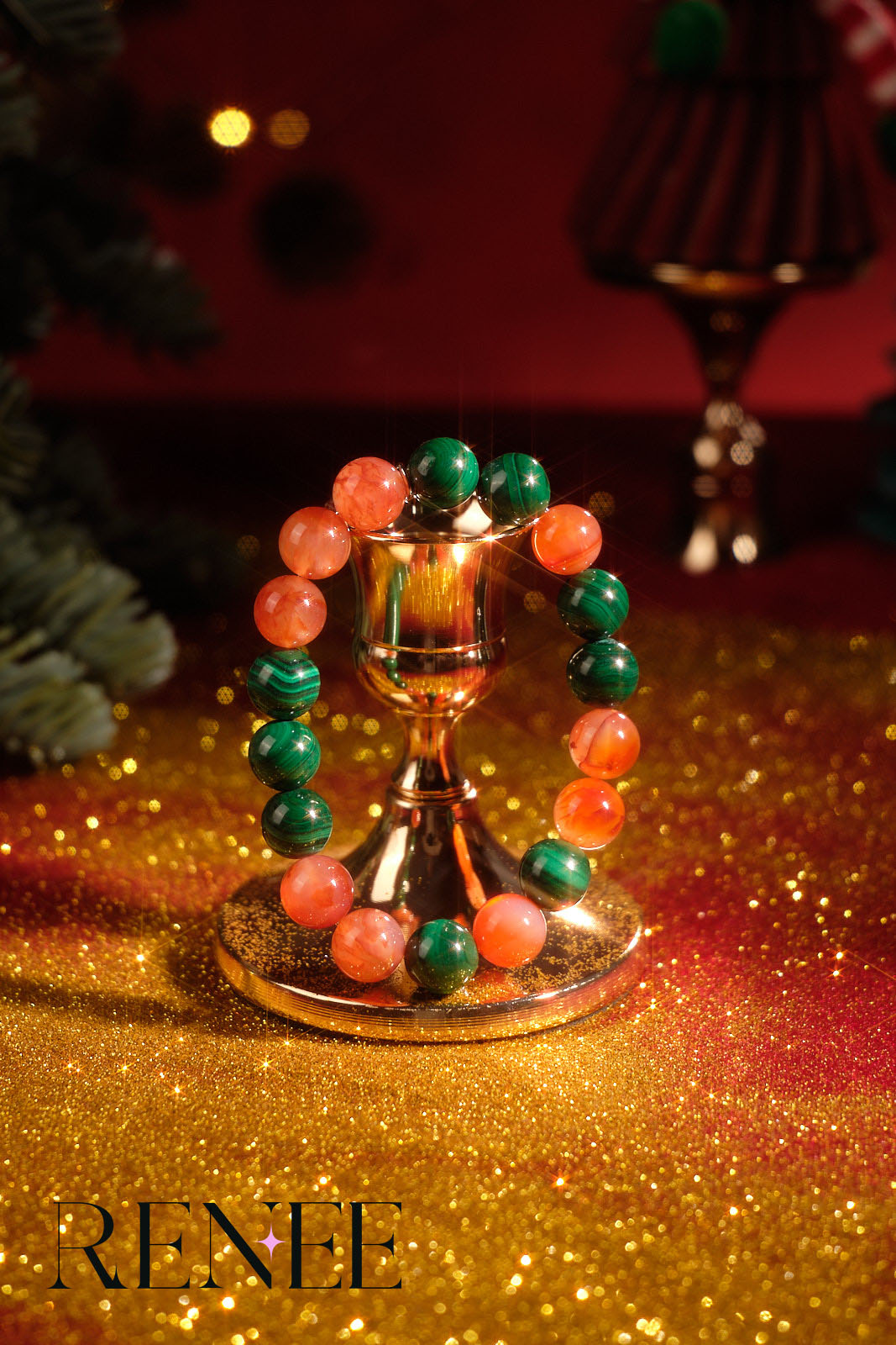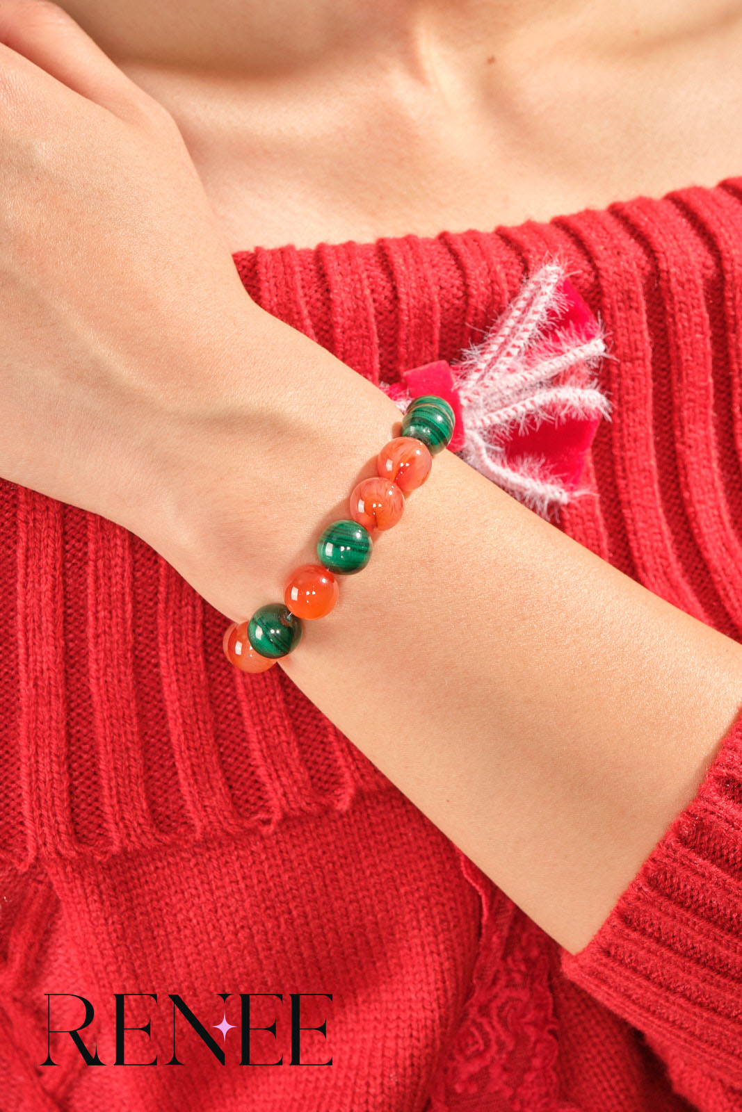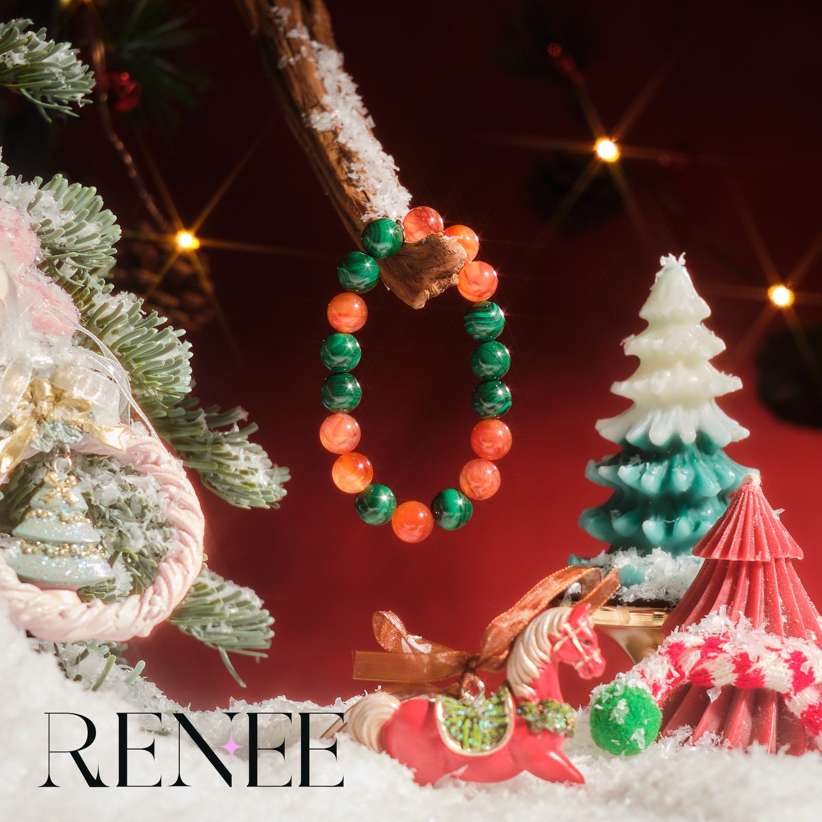 The bracelet uses a combination of green crystal with a unique texture and warm-toned red crystal. The texture of the green crystal resembles the mysterious veins of a Christmas forest, while the red crystal is like the warm lights of a cabin in the woods, as if condensing the fairy tale scene of Christmas on the wrist, full of fantasy.