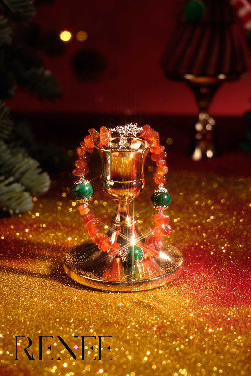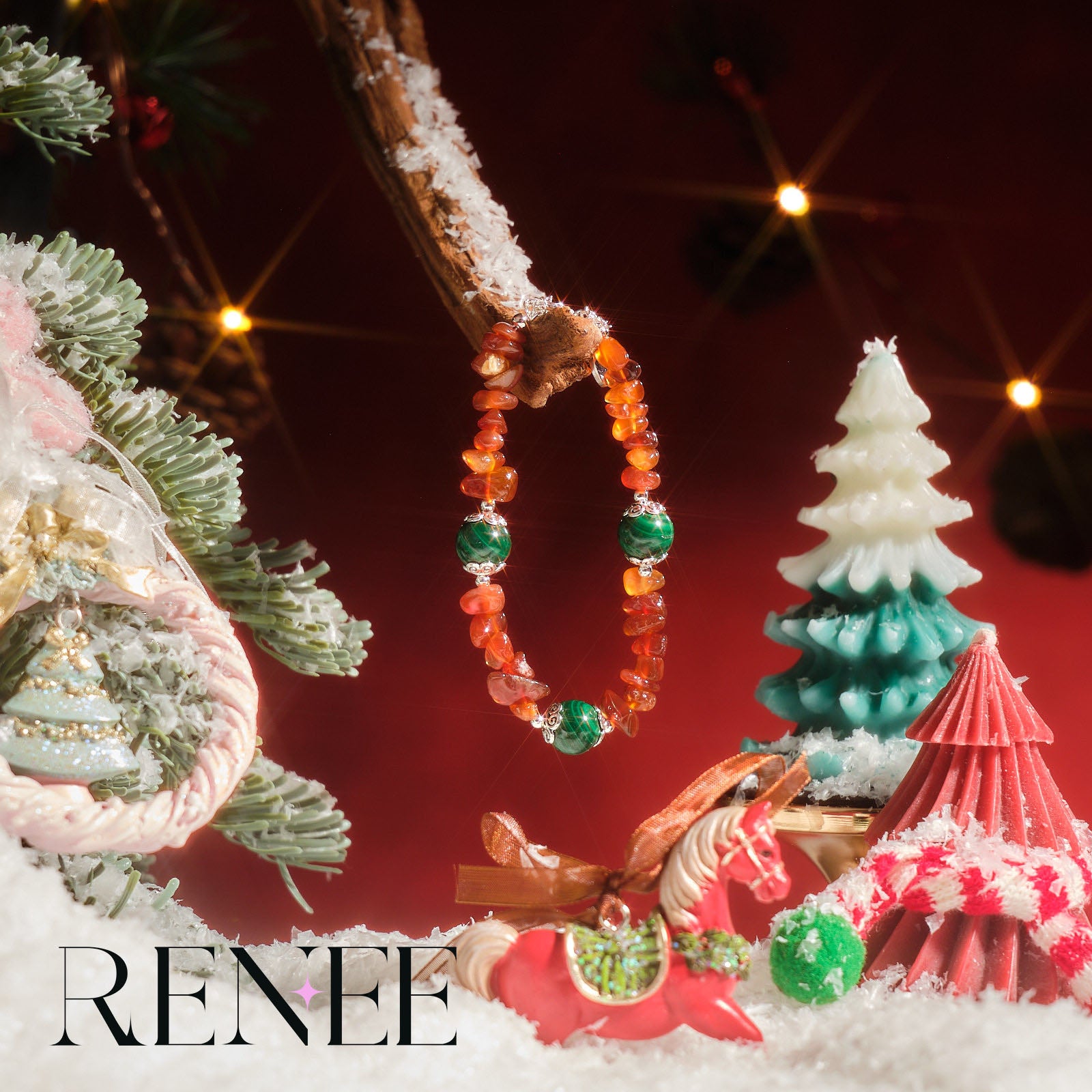 This bracelet is made of irregular red and green crystals, paired with silver accessories. Red and green are classic Christmas colors. The irregular crystal shapes resemble the random placement of Christmas gifts, while the silver accessories resemble silver decorations on a Christmas tree, giving the whole look a casual yet festive feel.