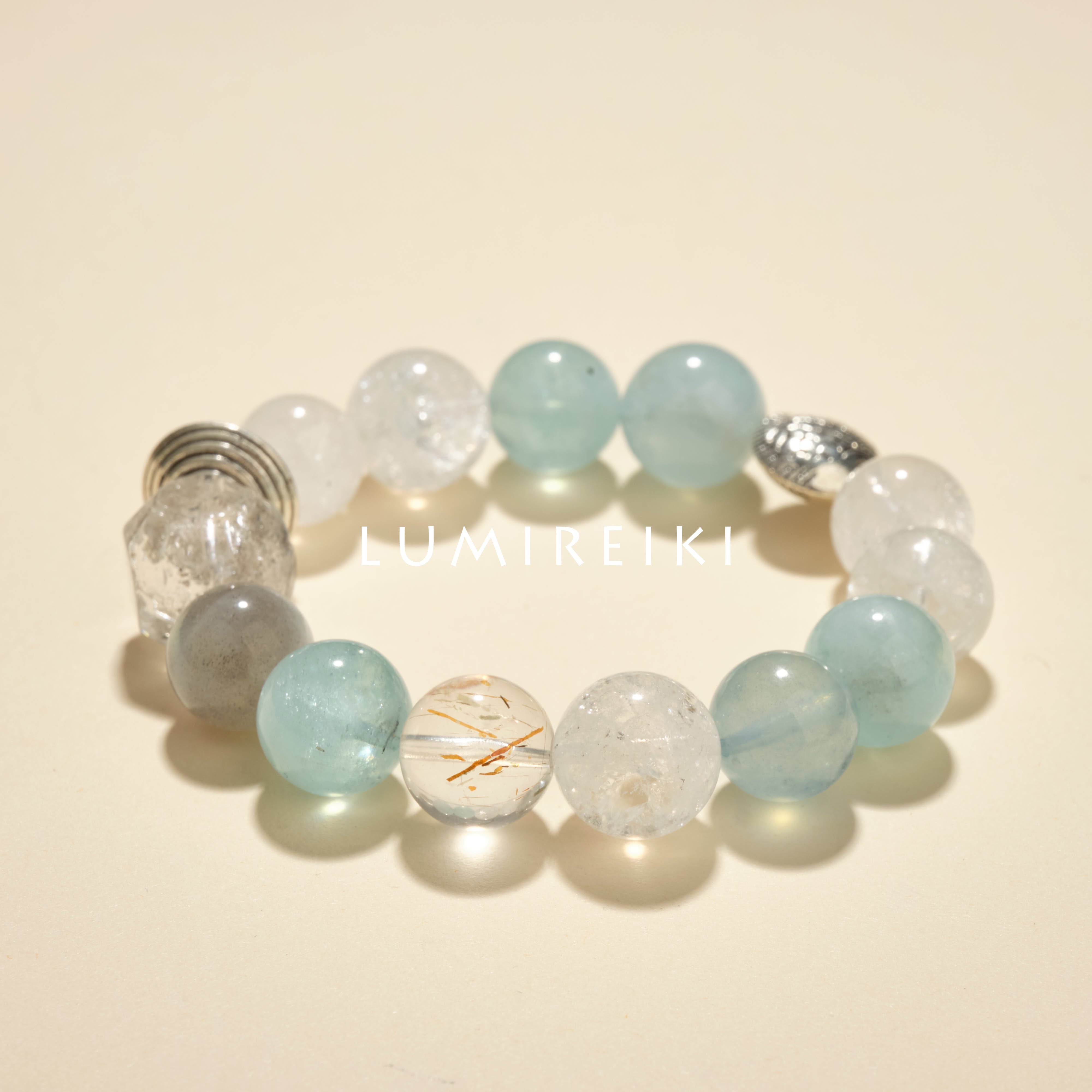 Aquamarine (14mm / 15.4mm): Mined in Brazil and Afghanistan, it corresponds to the throat chakra. It soothes the throat, regulates the respiratory tract, calms anxiety, and enhances communication wisdom. The larger 15.4mm Aquamarine further intensifies the throat chakra energy, benefiting those who use their voices frequently by improving respiratory allergies.