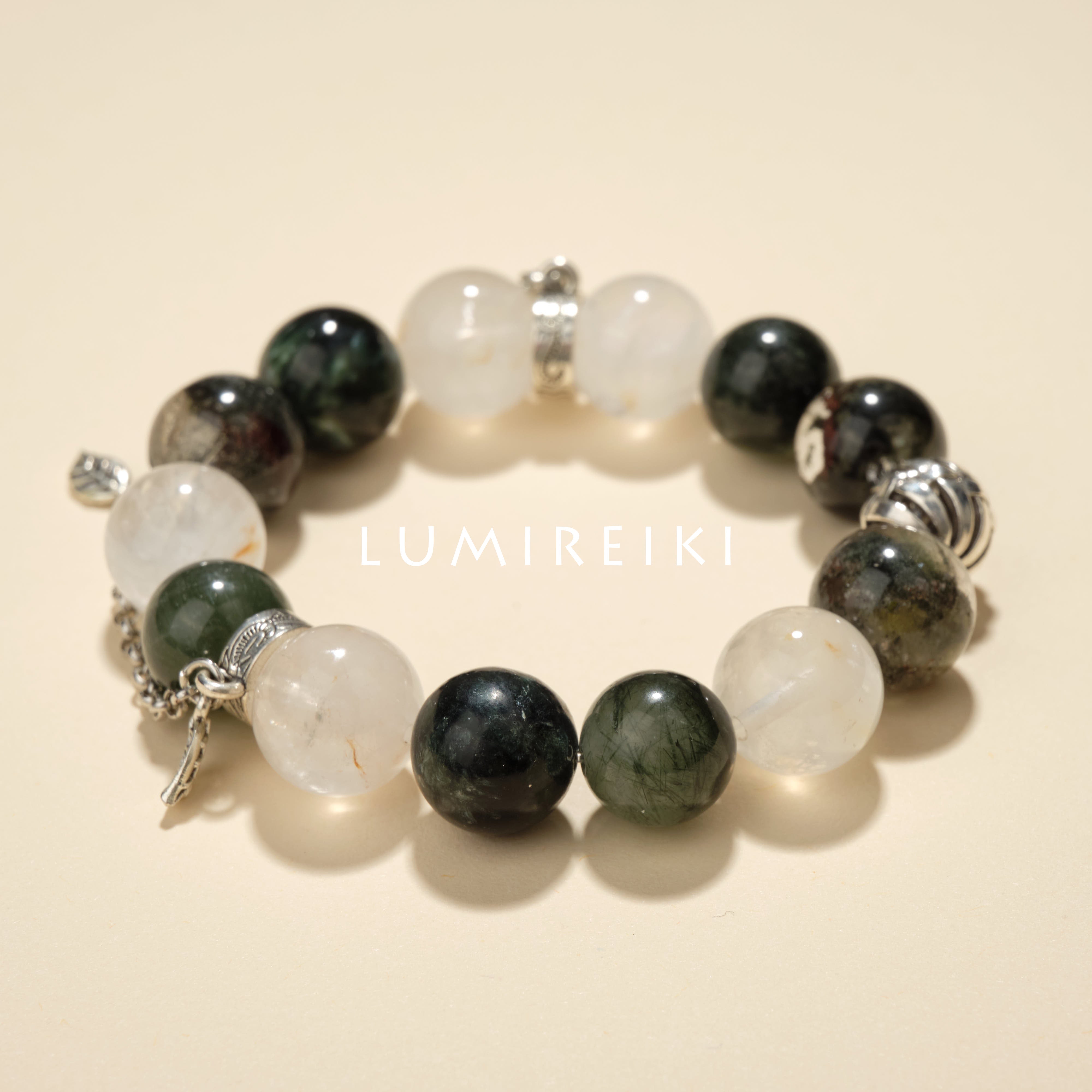 Green Seraphinite (13.2mm): Associated with the heart chakra (Taurus). It soothes shoulder and neck tension, improves respiratory function, releases anxiety, and builds inner strength and security.