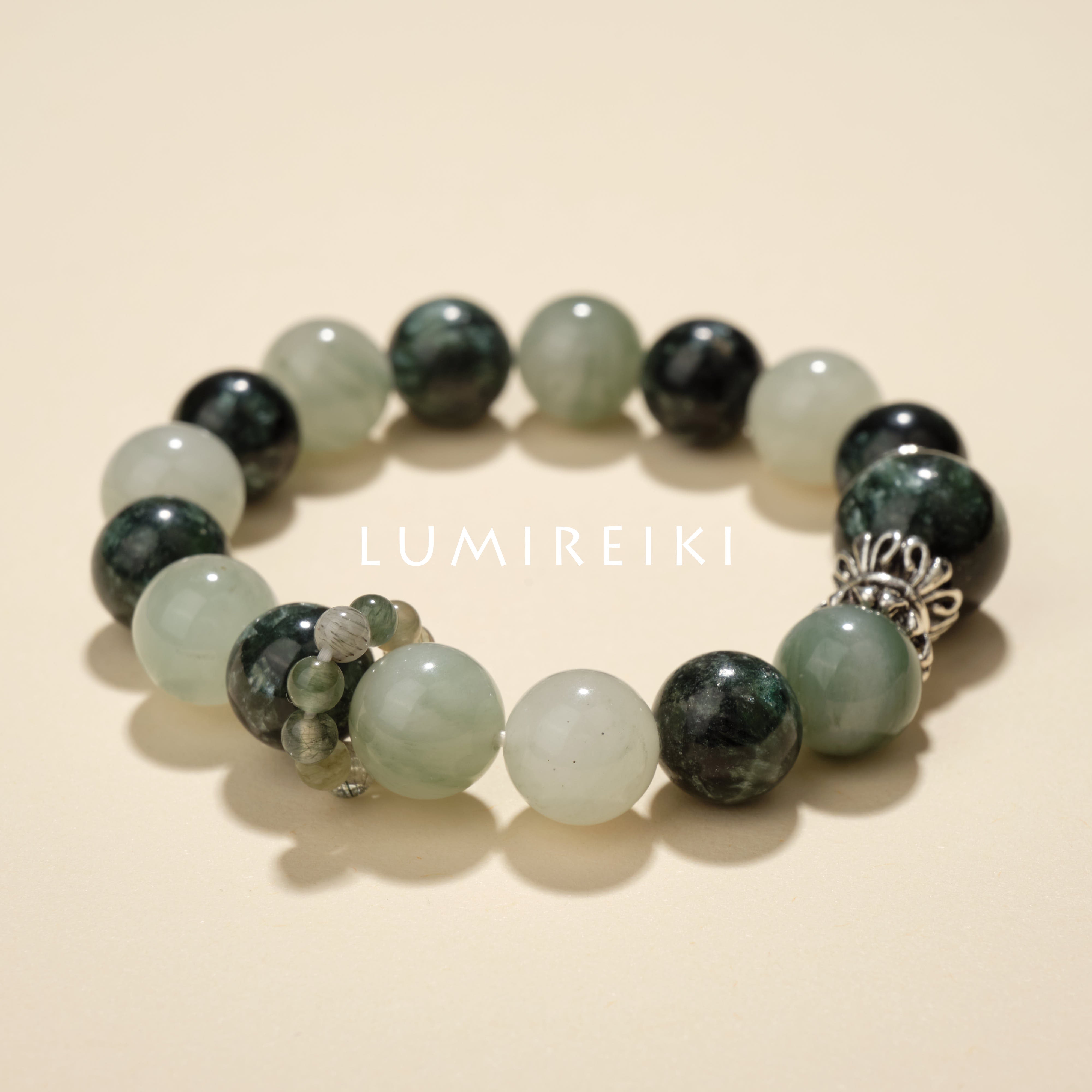 This bracelet supports those facing stress, anxiety, or physical strain. It soothes tense shoulders from desk work, eases digestive issues from daily pressure, and boosts confidence in conversations. Green Seraphinite calms during busy meetings, while Aquatic Agate and Tianshan Cui aid comfort and clarity. Wear it at work, in social settings, or to unwind, and embrace balanced well-being.