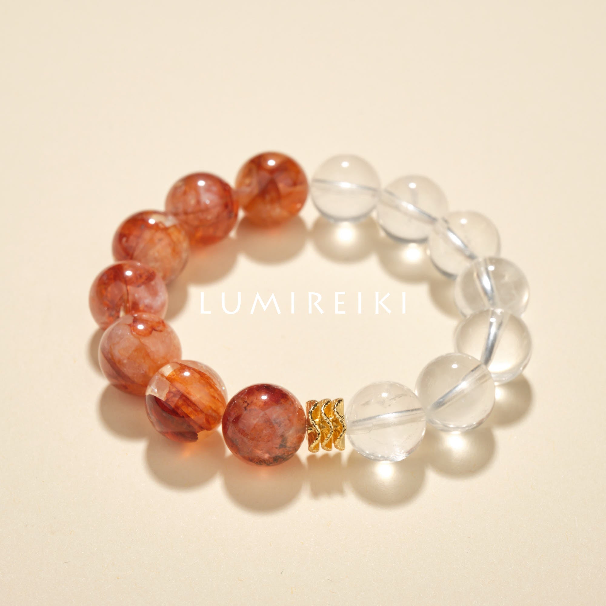 One glance at this Red Amethyst & Clear Quartz of the bracelet, you'll sense its aura - power. Red Amethyst, with deep - hued "flowers", activates the root chakra, boosting vitality, easing fatigue, and sparking courage. Clear Quartz purifies auras, sharpens thoughts, and balances intensity. For those craving body - mind grounding, it's a soul booster. Wearing it steadies your inner self, taming stress impulses. A natural power piece, it helps battle chaos and pressures. Like a warm glow, it feeds resolve, breaking slumps to rise, feet rooted.