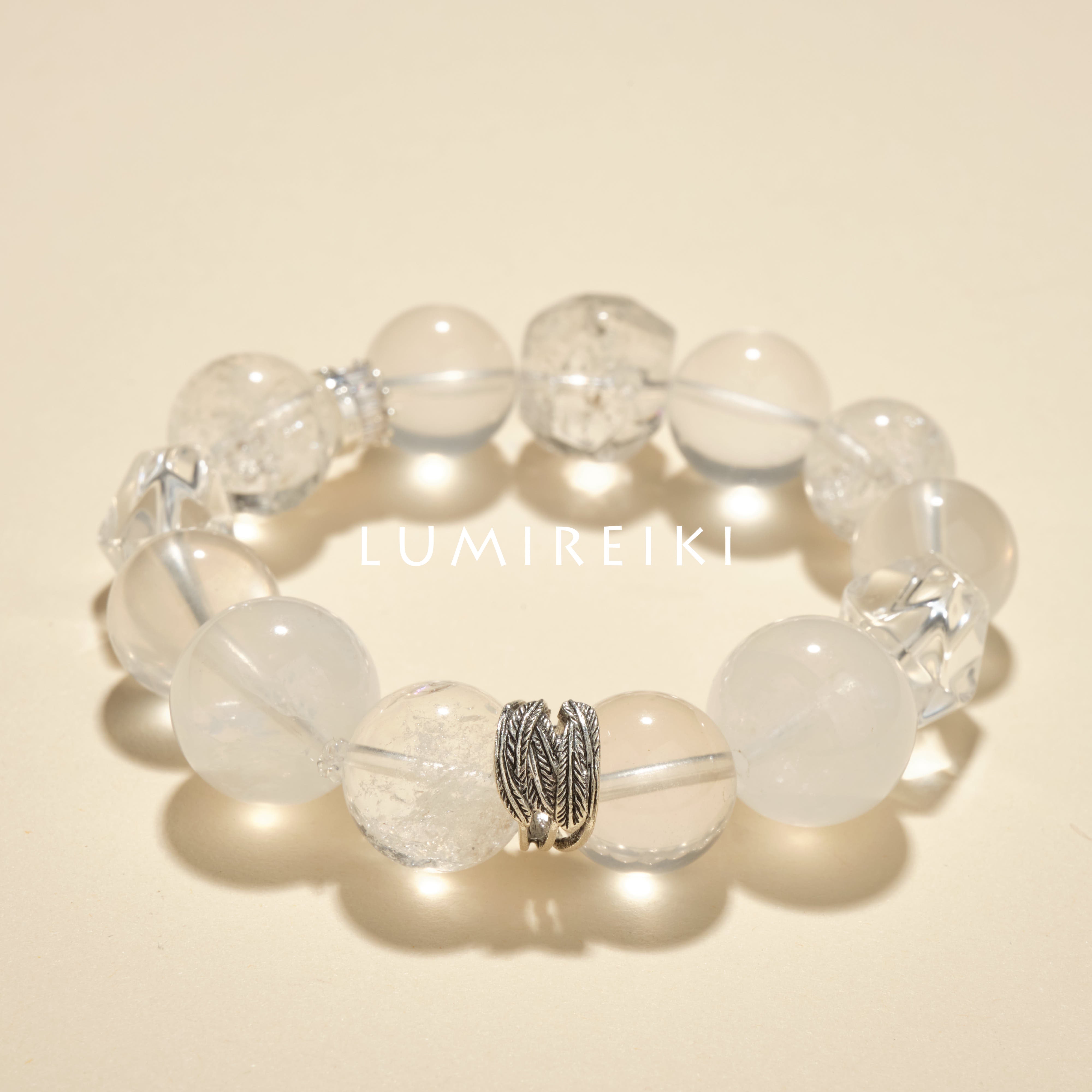 Milky White Quartz (14mm): Linked to the crown chakra, associated with Cancer and Pisces. Originating from Brazil and the US, it soothes nerve tension, promotes sleep, and imparts a sense of security and calm.