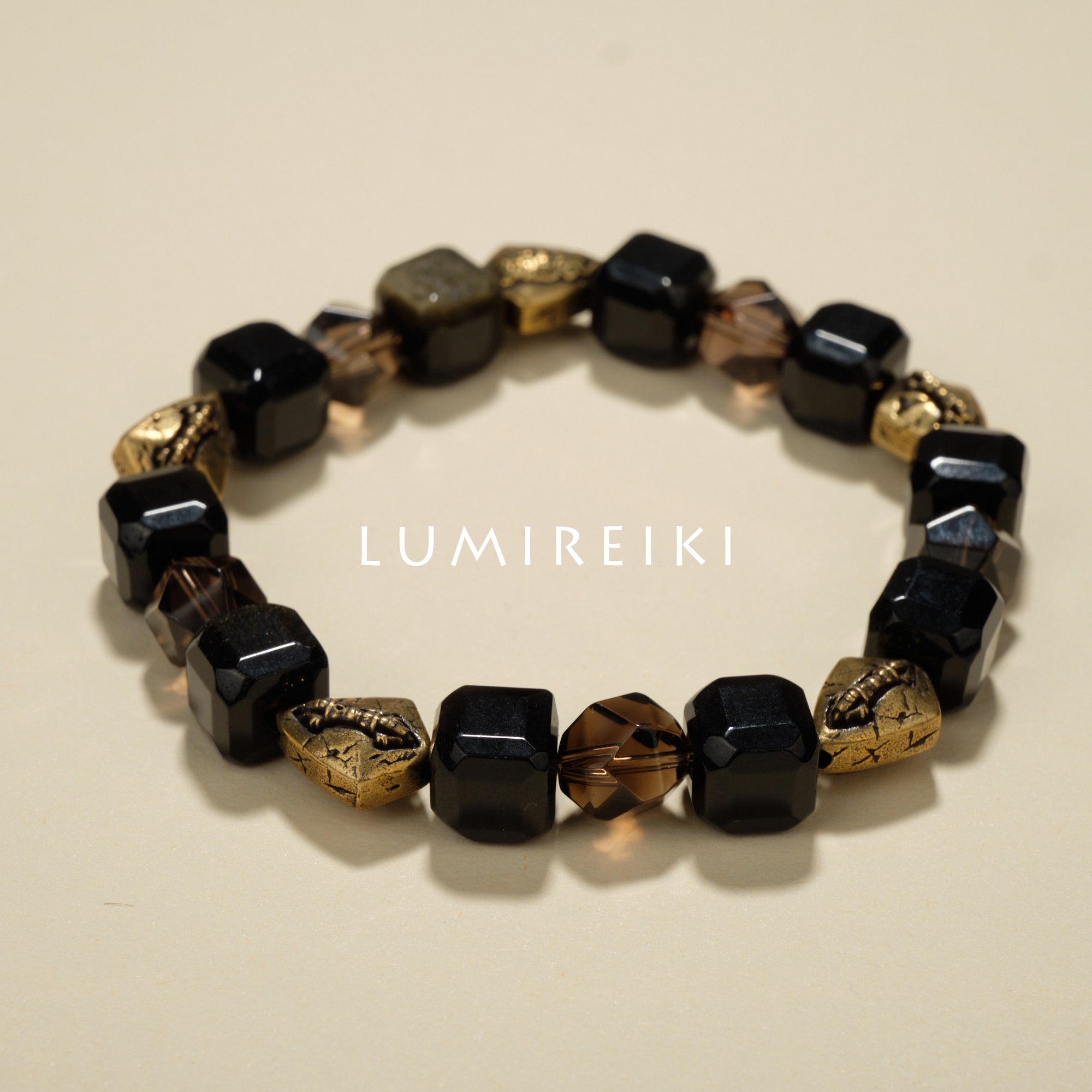 This bracelet showcases 7.8mm Smoky Quartz, a symbol of stability and focus. It soothes anxiety, stabilizes mood, and helps you stay calm in busy life. Paired with 8.6mm Obsidian cubes, it forms a powerful shield against negative energy, ensuring you face challenges with a clear mind and unwavering confidence.