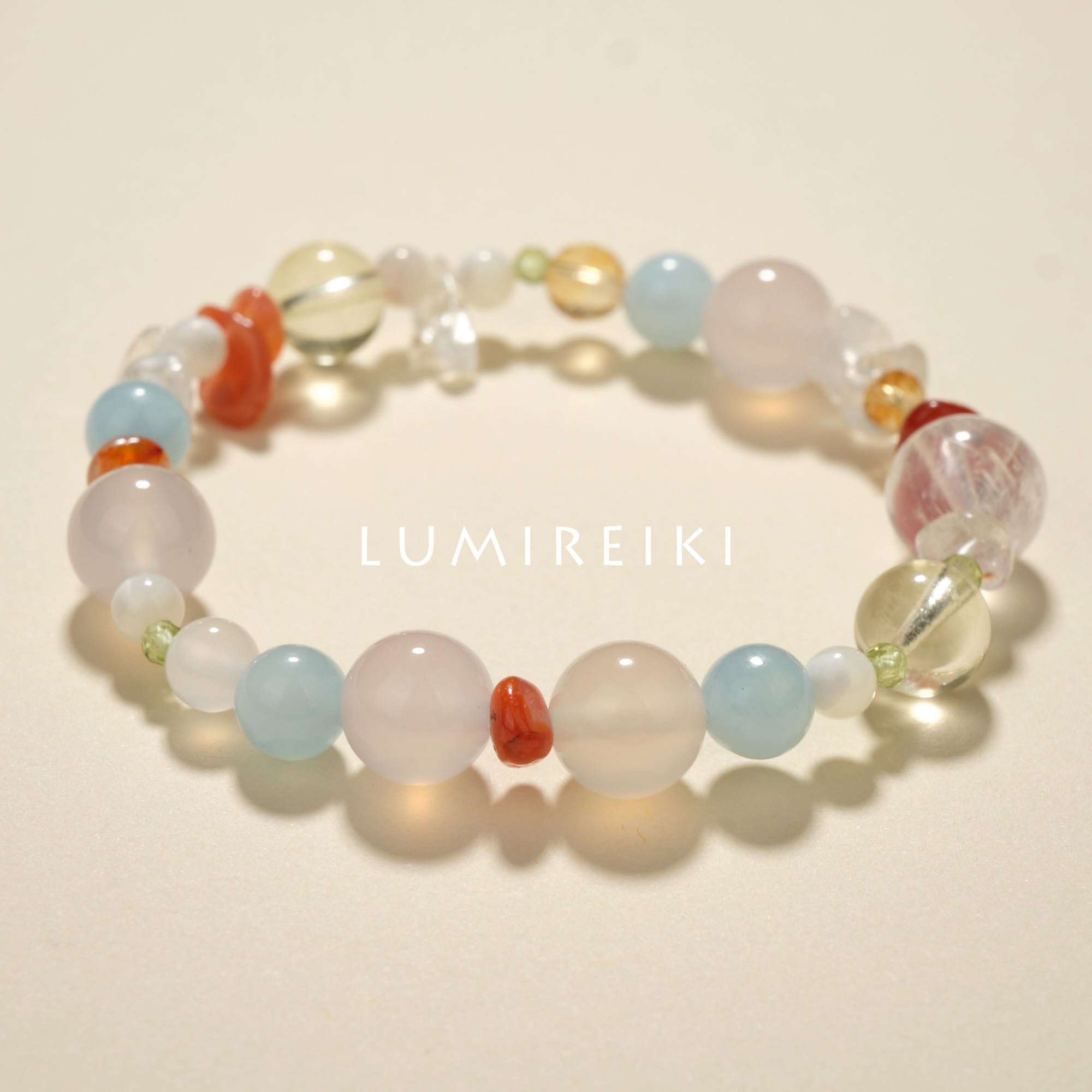 This bracelet is for those trapped in life’s doldrums—overwhelmed by work, drained by stress, or lost in negativity. Picture endless workdays, joyless evenings, or mornings filled with dread. Lemon Quartz blasts away gloom, pouring in vibrant energy. Milky White Chalcedony calms nerves, White Crystal purifies chaos. Citrine hints at opportunities, Aquamarine offers courage. Wear it when motivation’s low or during tense moments—let it reignite passion and guide you back to positivity.