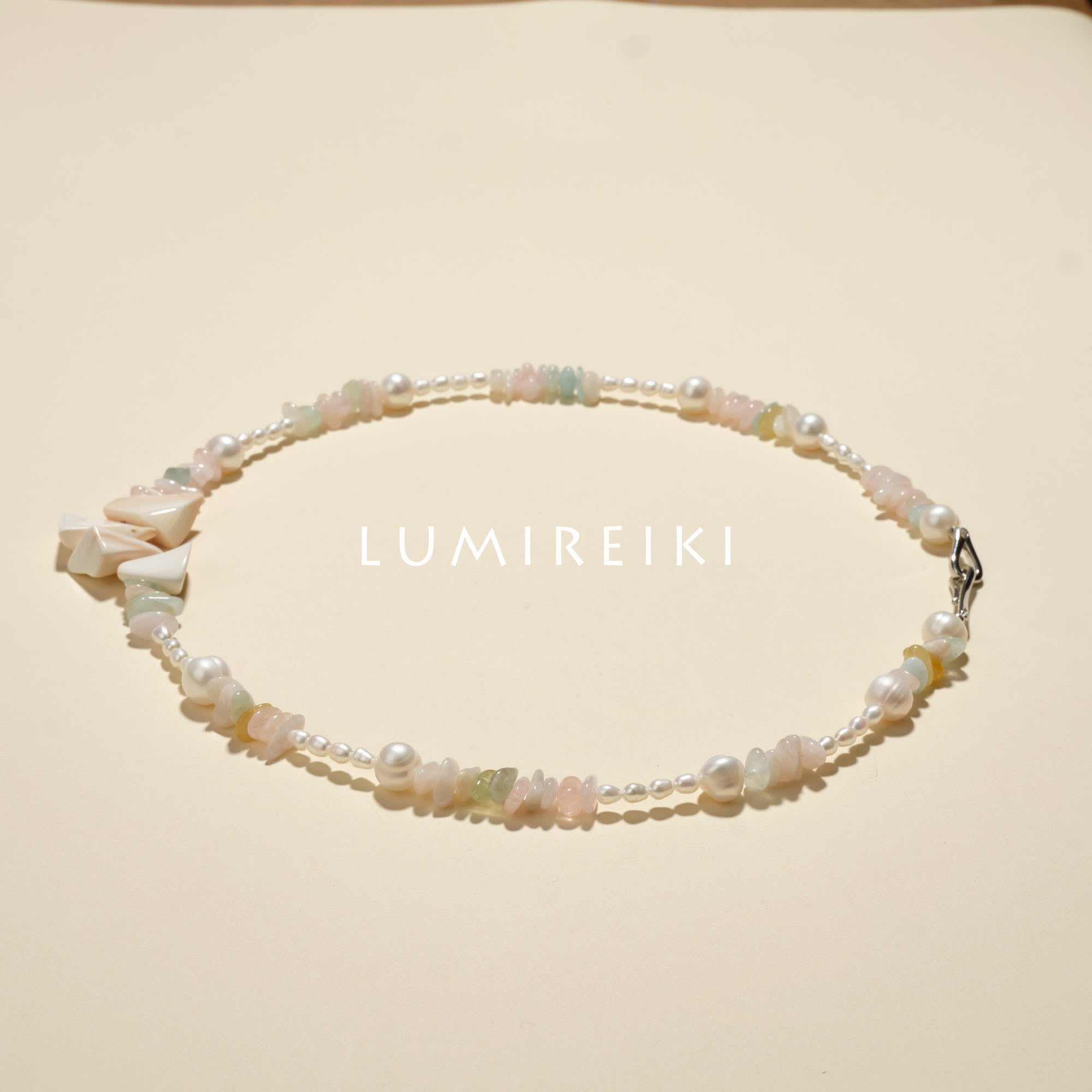 Embrace tranquility and affection with the White Shell Serenity Necklace. Its white shell calms your mind and purifies your aura, while pearls and morganite soothe your emotions, enhance elegance, and spark love. Let this necklace be your daily dose of peace and connection.